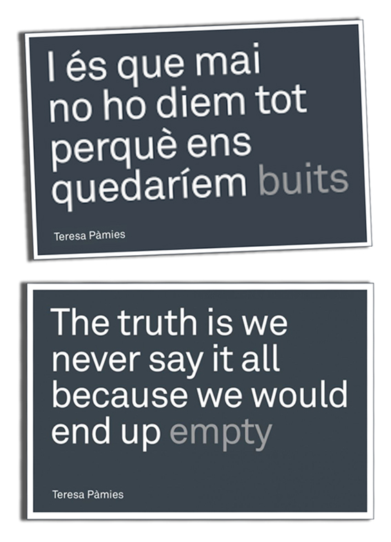 L’any 2019, pensant en la projecció de la cultura catalana a l'exterior, l'Institut Ramon Llull va col·laborar en l’edició d’una nova sèrie de postals, traduint-les a l'anglès i presentant-les a diverses fires i festivals internacionals. La cita de Teresa Pàmies va ser una de les escollides per a aquest propòsit.